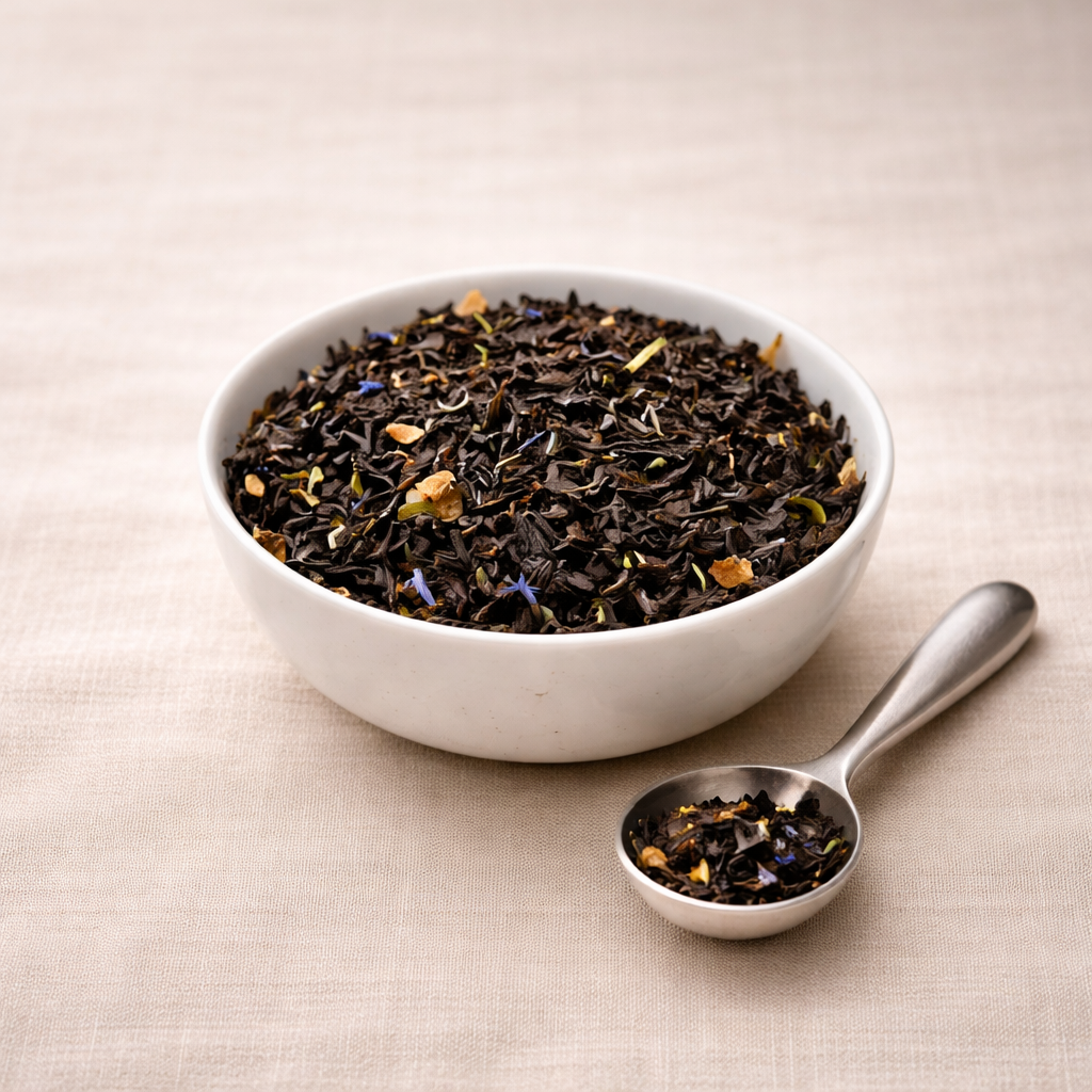 Decaffeinated black tea, bergamot, rose, calendula, blue cornflowers, natural flavour.