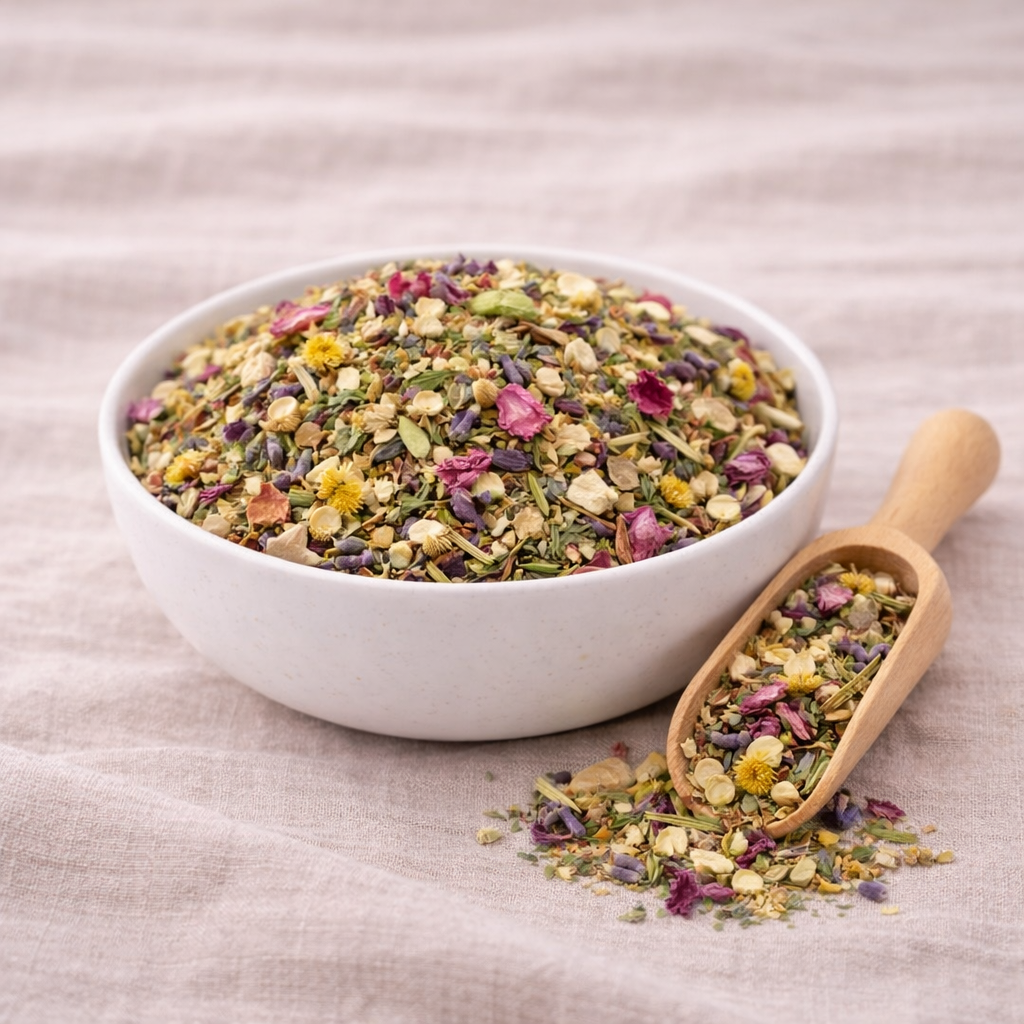 Lemon balm, pear, ginger, lavender, apple, rosemary, dandelion root, chamomile, rose petals, lime tree blossoms, rose buds, mallow blossoms, heather blossoms.